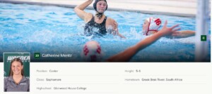 Catherine Mentz is a talented South African water polo player who has achieved success both locally and internationally. She represented Eden Water Polo U19 at the SA Schools Interprovincial Tournament in Cape Town, where the team won the Outstanding Sportsmanship Trophy.