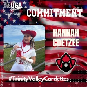Hannah joined us from Gymfinity in Johannesburg, South Africa. A talented dancer with her national colours, Hannah was looking to take her dance and cheer international. At BRUSA Sports we helped Hannah secure a cheer scholarship to attend Trinity Valley Community College in Texas where she joined the Cardette Showgirls. The Cardettes are an internationally acclaimed precision dance team, established at Trinity Valley in 1960.